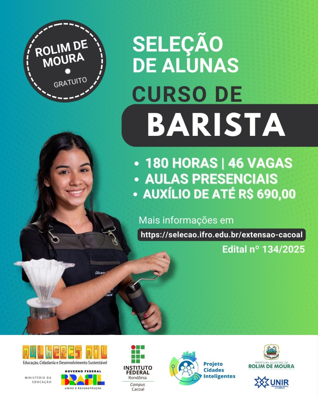 O Instituto Federal de Rondônia (IFRO), por meio do Campus Cacoal, está com inscrições abertas para o Curso de Formação Inicial de Barista, totalmente gratuito e voltado exclusivamente para mulheres.