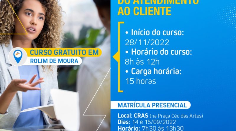 As matrículas, que são presenciais, acontecerão no CRAS de Rolim de Moura, localizado na Praça Céu das Artes, no horário das 7h30 às 13h30. Não perca a oportunidade e programe-se! Assista ao vídeo!