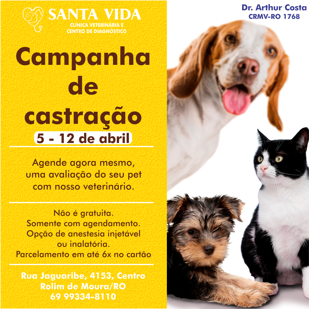 A Clínica Veterinária Santa Vida em Rolim de Moura está realizando uma campanha de castração para ajudar a garantir a saúde e o bem-estar dos animais de estimação da cidade.