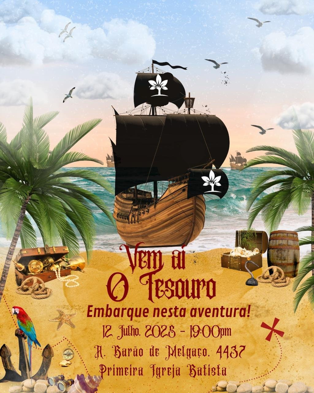 Durante as férias escolares, a Primeira Igreja Batista de Rolim de Moura convida crianças e famílias para participarem de uma aventura inesquecível com o evento temático “Vem aí o Tesouro”, que será realizado no dia 12 de julho, às 19h, na sede da igreja, localizada na Rua Barão de Melgaço, 4437.