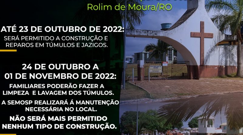 A prefeitura de Rolim de Moura (RO), informa que as obras no cemitério municipal São José, só poderão ocorrer até dia 23 de outubro. Após essa data não será permitida edificações no campo santo.
